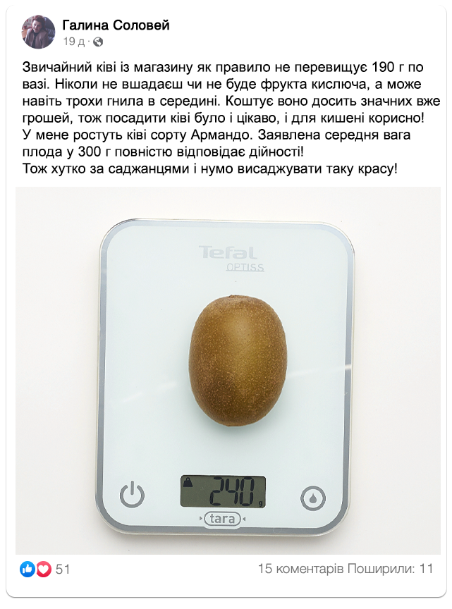 Замість дрібних магазинних фруктів, ви можете вирощувати у власному саду крупні та дійсно солодкі ківі. Кожен фрукт 300-350 г вагою!