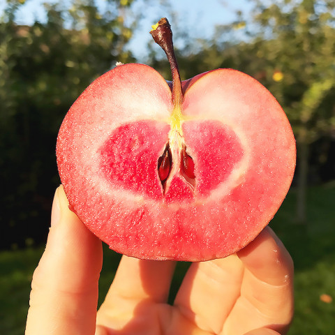 Яблука з червоною серединкою новий тренд у садівництві, але зовнішня привабливість не єдина перевага цих фруктів. Яблука корисні різноманітними властивостями. Одним із факторів, що сприяють цінності для здоров'я, є вміст червоних пігментів антоціанів. У червониом'ясих яблуках не тільки шкірка плодів містить такі сполуки, але і вся плодова м'якоть. Порівняймо зі звичайними в червоном'ясих яблуках міститься величезна кількість антоціанів та антиоксидантів, які є корисними для здоров'я людини, послабляючи певні шкідливі реакції в клітинах, які можуть призвести до раку.